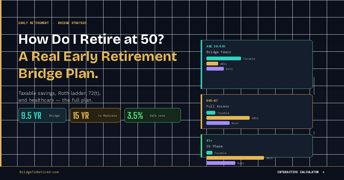 If you retire at 50, your portfolio has to do two jobs at once: fund your current lifestyle, and preserve enough long-term money for later decades. That is why early retirees need a real bridge strategy, not just a savings target. Without a bridge plan, "retire at 50" can turn into "retire at 50 and scramble at 53."